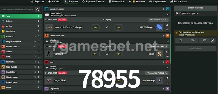 O 78955 oferece uma grande seleção de opções de apostas em e-sports com probabilidades competitivas